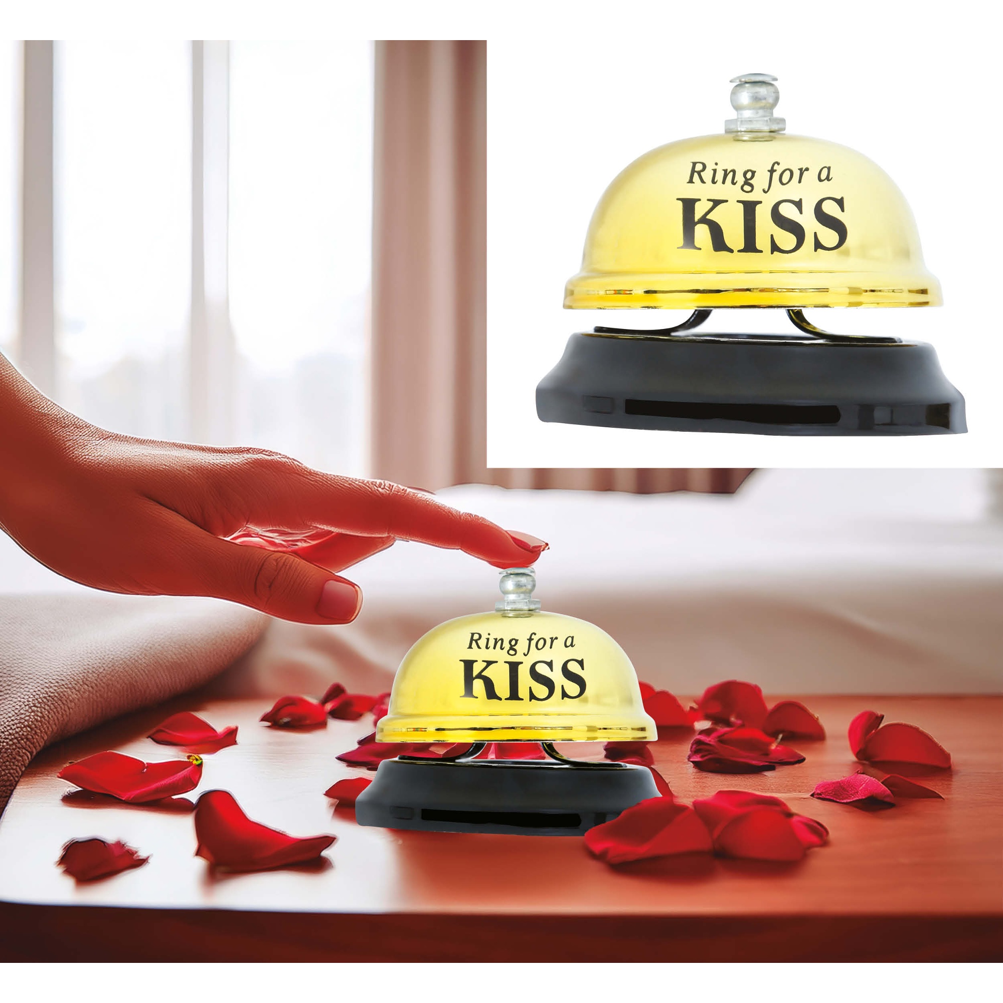Petite sonnette de table au message amusant « Ring for a KISS », pensée pour créer des moments romantiques et des surprises entre partenaires. Sa cloche métallique produit un son clair et reconnaissable lorsque vous appuyez dessus, parfait pour attirer l'attention avec tendresse. C'est un cadeau original pour les anniversaires, escapades romantiques ou dîners intimes. Facile à utiliser et au design coquet qui embellit toute table de chevet ou tout plateau.