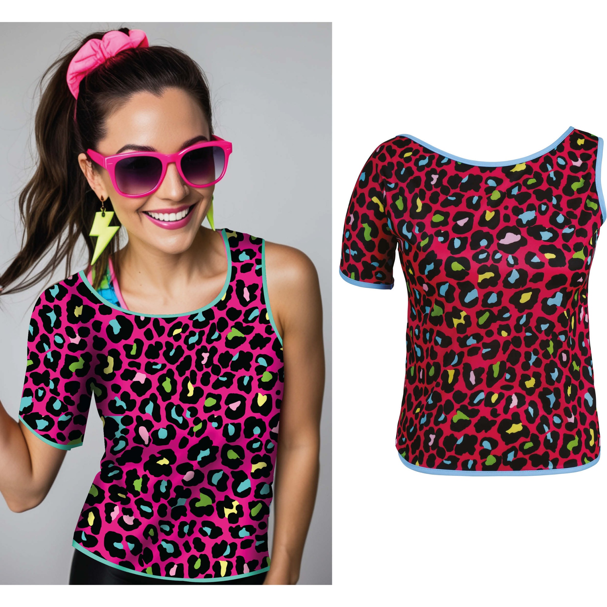• Motif léopard néon vibrant inspiré des années 80.
