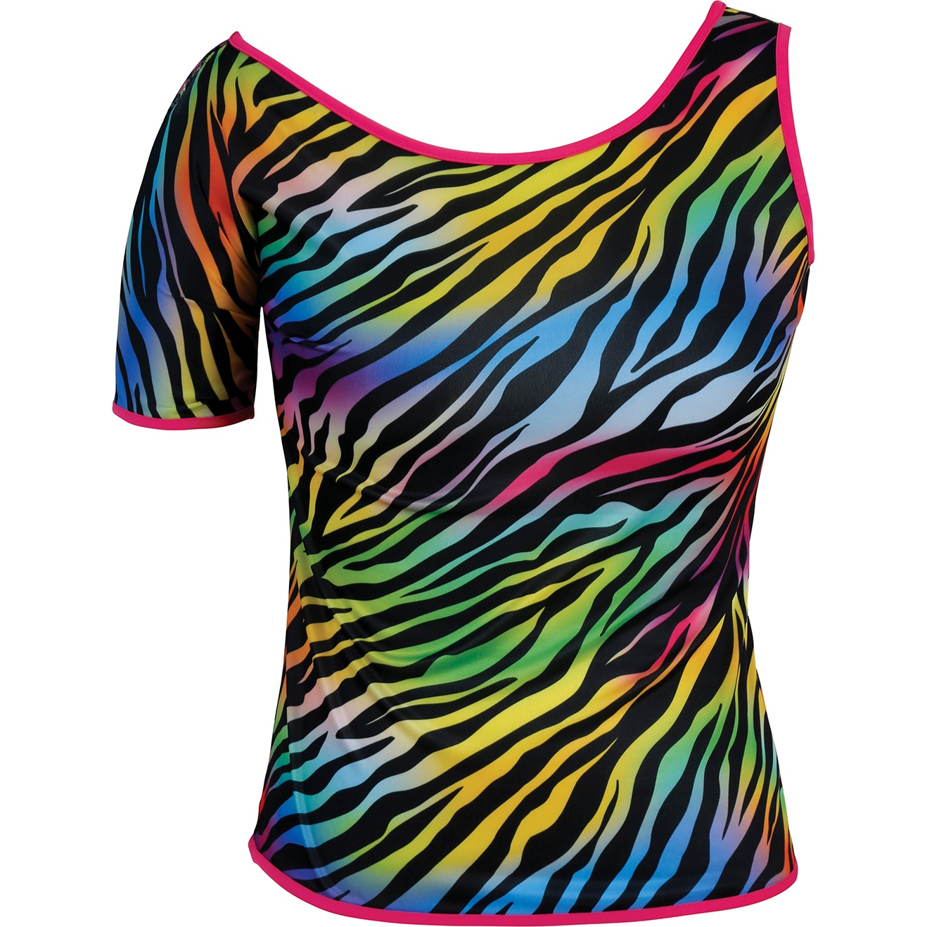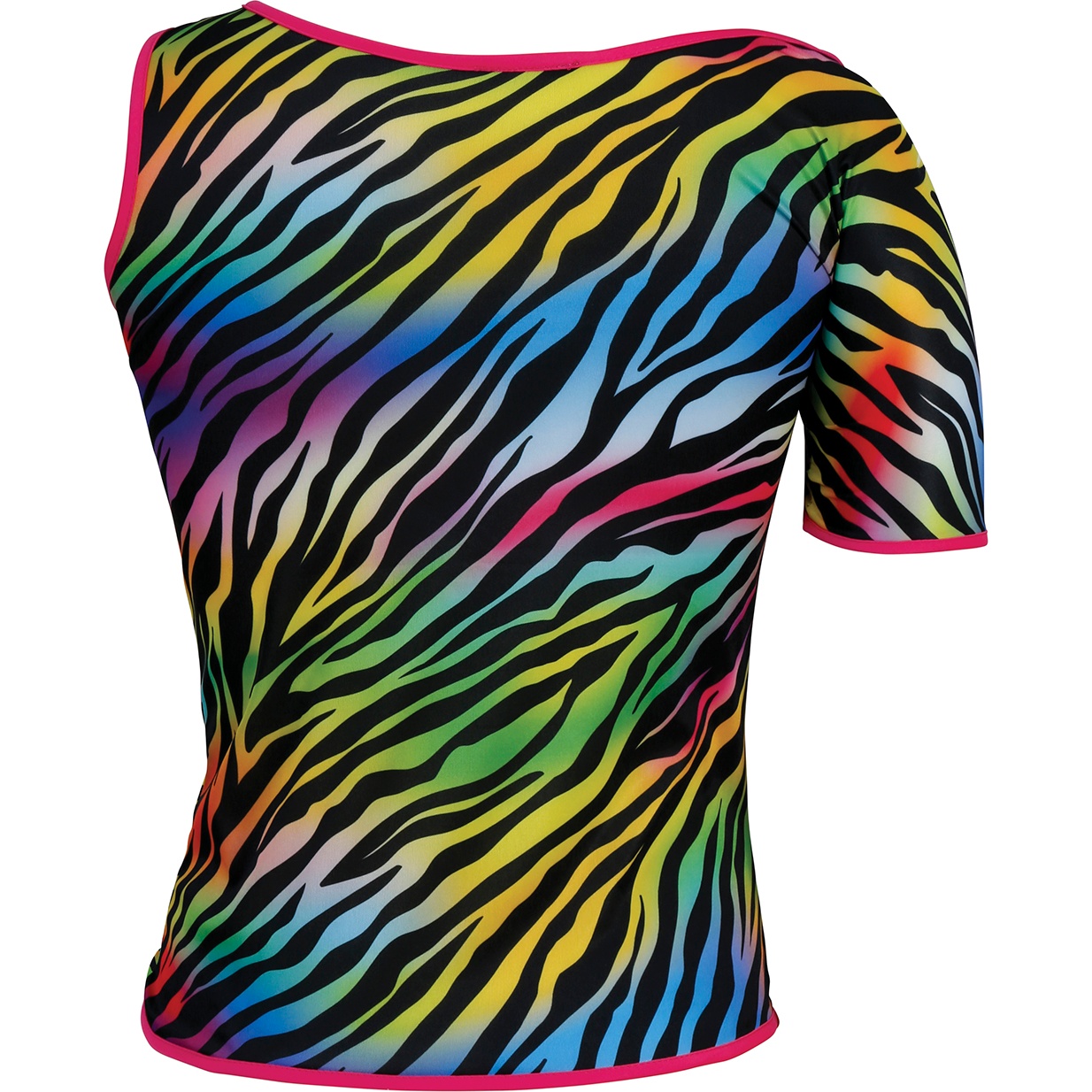 Faites vibrer la piste de danse avec ce t-shirt zèbre aux tons néon inspiré des années 80. Son imprimé vibrant et sa bordure rose en font une pièce remarquée, idéale pour des looks rétro des années 80. Le modèle présente une encolure asymétrique et des manches courtes qui apportent une touche rétro et dynamique. Conçu pour se démarquer, il se combine facilement avec des accessoires de soirée.