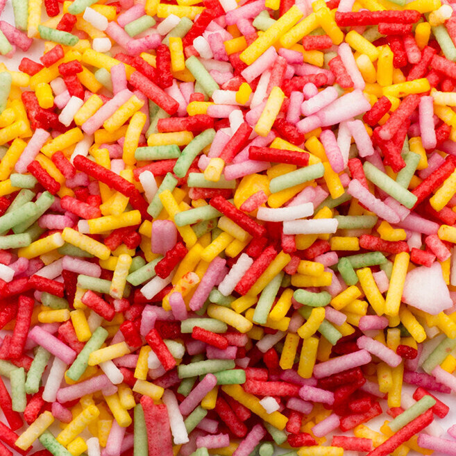 Ingrédients: sucre, concentré de produits végétaux (radis, citron, groseille, carthame, betterave), huile de coco, eau, concentré d'algues (spiruline), sirop de glucose, colorant [E-100] et agent d'enrobage [E-901].