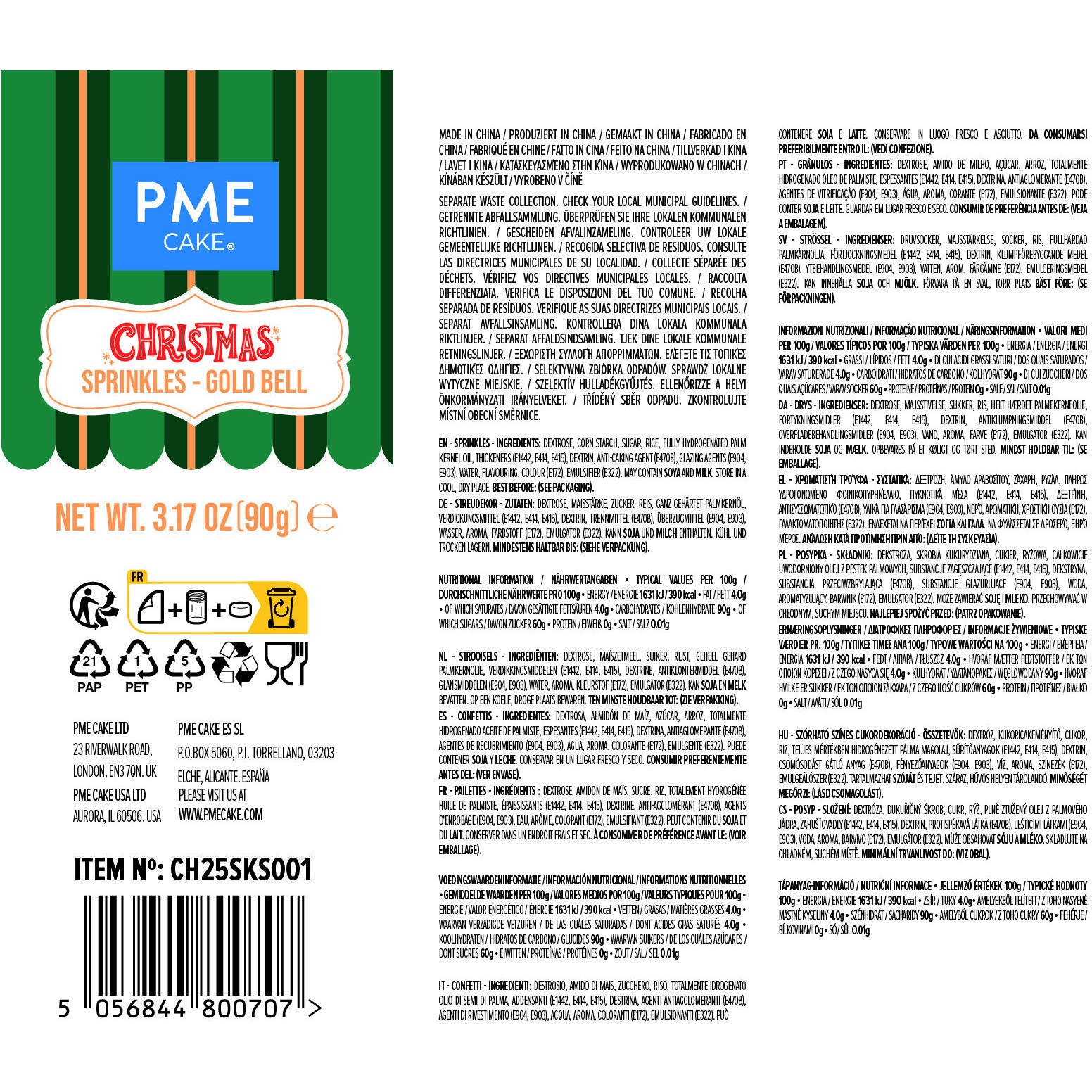Ingrédients: dextrose, amidon de maïs, sucre, huile de palmiste totalement hydrogénée, épaississants (E1442, E414, E415), dextrine, anti-agglomérant (E470B), agents d'enrobage (E904, E903), eau, arôme, colorant (E172), émulsifiant (E322).