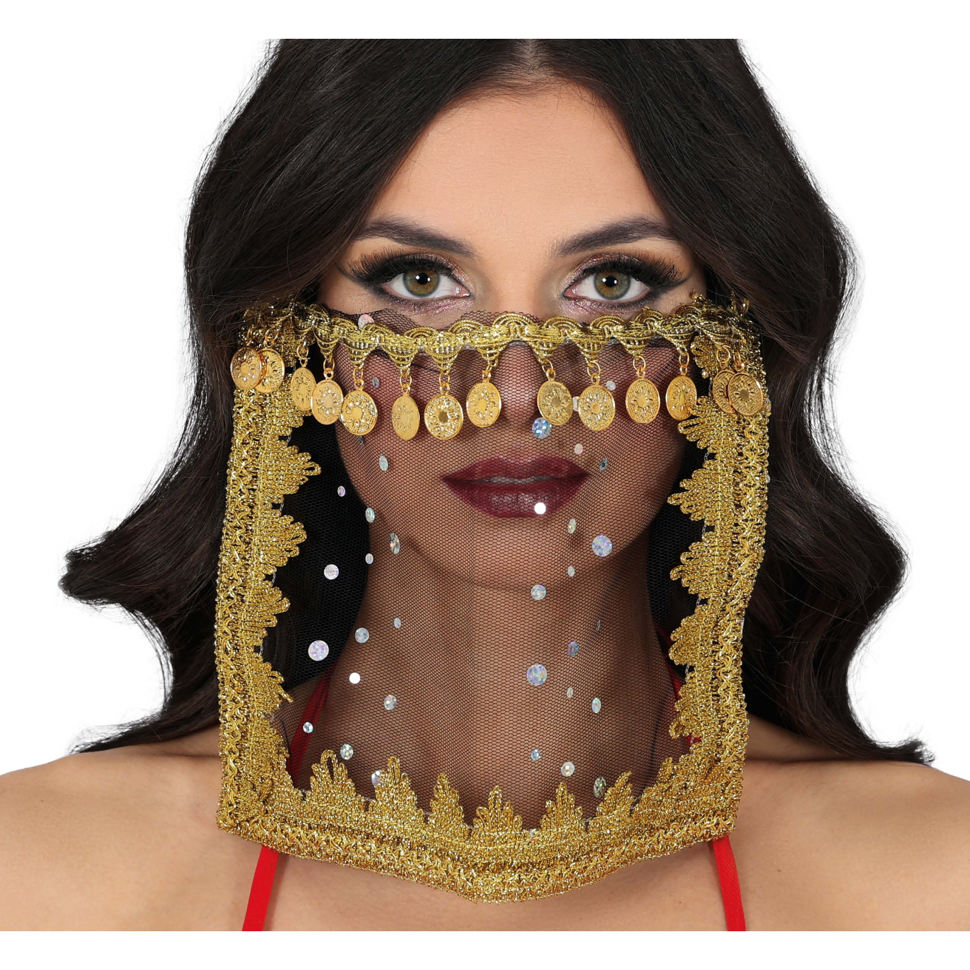 Voile élégant noir, conçu pour la danse orientale et les fêtes à thème. Il présente un tulle translucide orné d'ornements dorés et de pièces qui apportent mouvement et sonorité à vos chorégraphies. La bordure travaillée en doré met en valeur n'importe quelle tenue et crée un effet saisissant sur le visage. Fabriqué en polyester, il est léger et confortable pour les spectacles et les séances photo. Livré avec un masque assorti couvrant la partie inférieure du visage, idéal pour composer des looks mystérieux d'inspiration orientale.